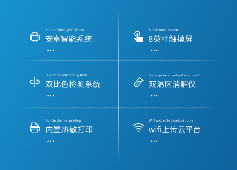 4、内置双温区8孔消解仪,左右温区独立控制,可对COD总磷总氮等进行快速消解。