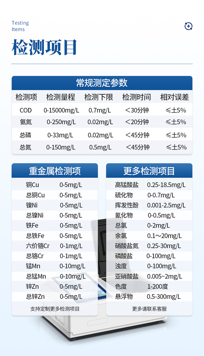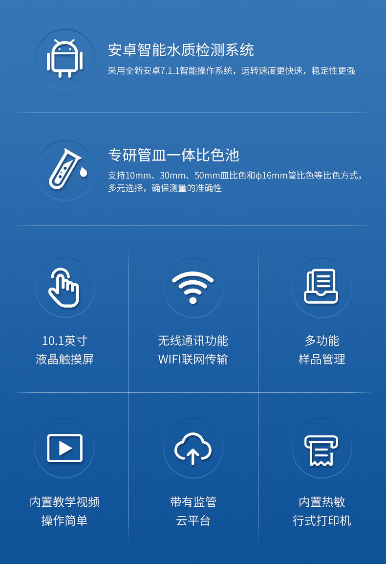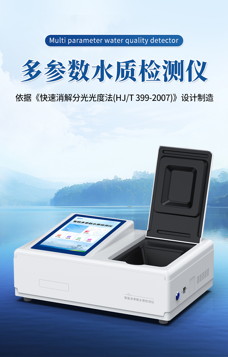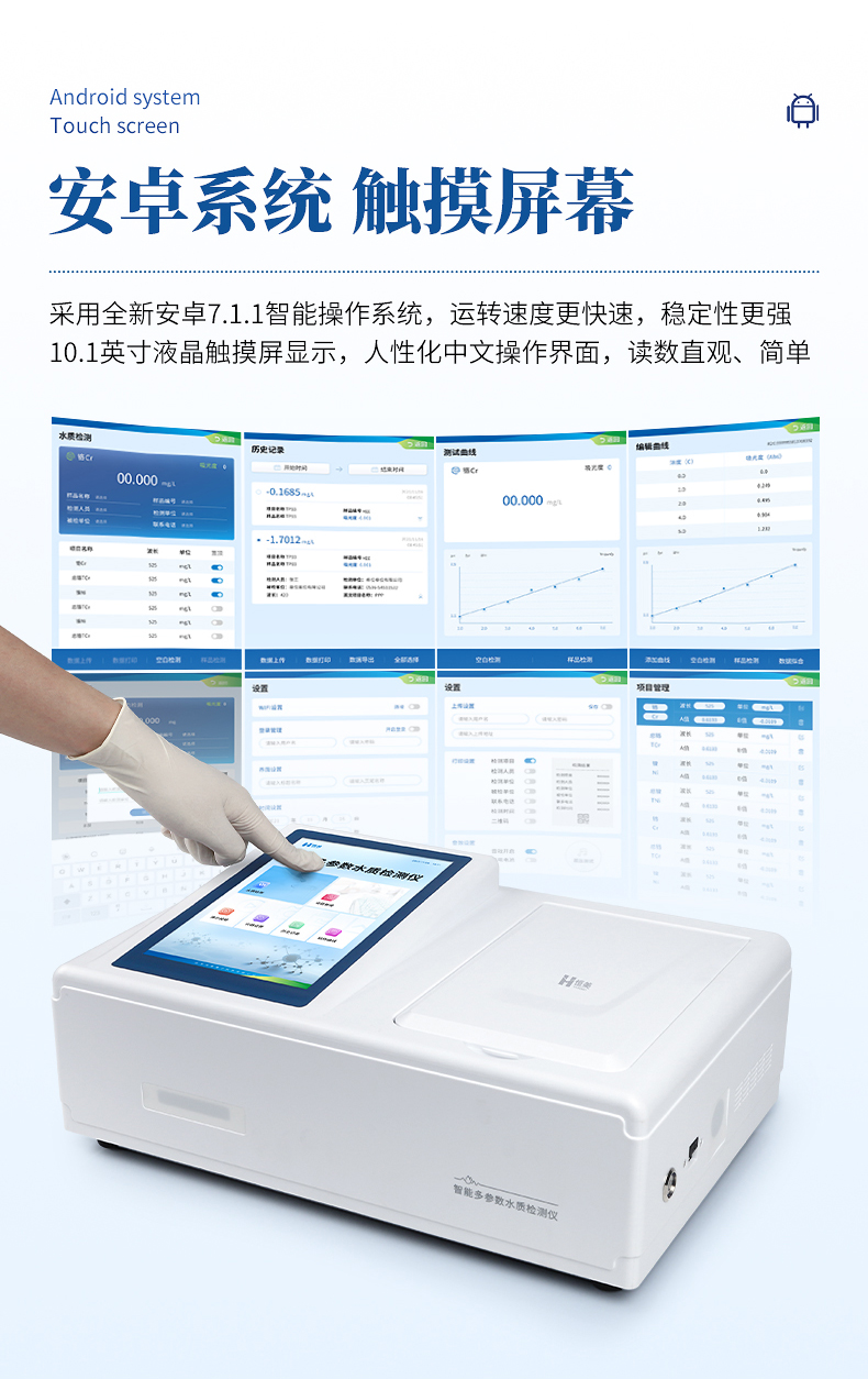 智能多参数水质测定仪是依据《快速消解分光光度法(HJ/T 399-2007)》设计制造,主要检测水质中COD、氨氮、总磷、总氮、磷酸根、硝酸盐氮、总铜、铜、铬、总铬、锌、总锌、亚铁、镍、总镍、锰、总锰、二氧化硅、总氯、余氯、镉、铅、钛、钒、银、铝、硼、砷、锡、铍、钡、锑、汞、钴、高锰酸盐、硫酸盐、氟化物、硫化物、氰化物、总氰化物、挥发性酚、苯胺、甲醛、甲醇、吊白块、二氧化硫、双氧水、浊度、色度、悬浮物、溶解氧、尿素、氰尿酸、亚硝酸盐、臭氧、pH、二氧化氯等指标;本仪器兼具智能数据分析功能,图表、列表显示数据,分析一目了然;高清晰度彩色液晶触摸显示屏,Android智能操作系统,中文显示界面,中英文键盘,人性化操作,使用更简单。