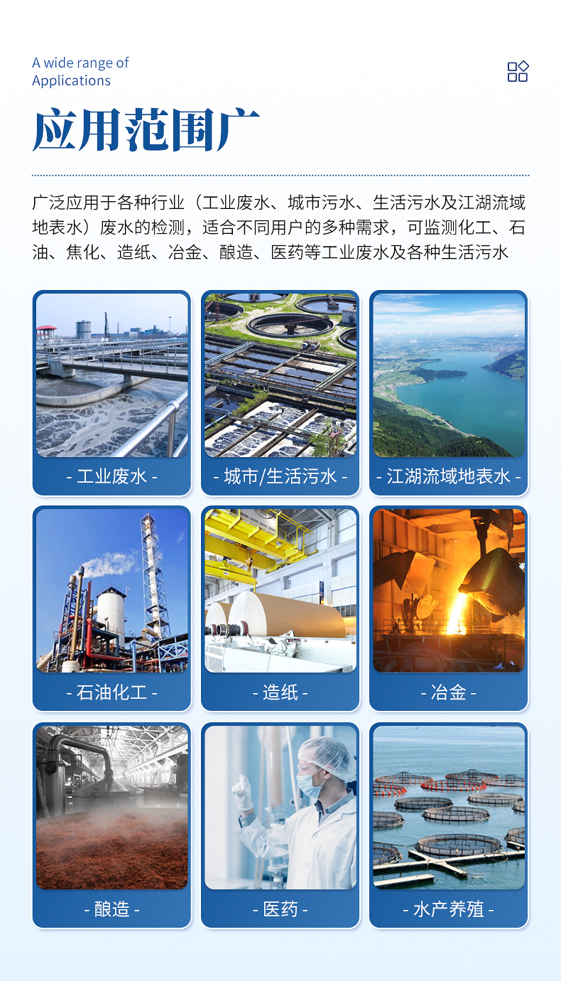 能够广泛的应用于各种行业(工业废水、城市污水、生活污水及江湖流域地表水)废水的检测,可适合不同用户的多种需求,可在化工、石油、焦化、造纸、冶金、酿造、医药等工业废水及各种生活污水监测应用。