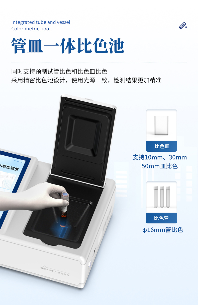 5、支持10mm、30mm、50mm皿比色和φ16mm管比色等比色方式,多元选择,确保测量的准确性;