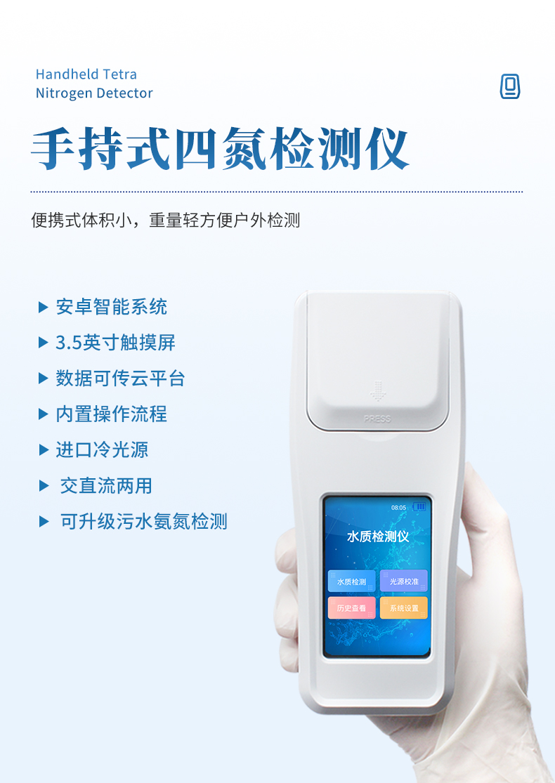 水质四氮检测仪是参考相关标准研发设计制造,本仪器主要检测水质氨氮、硝酸盐氮、亚硝酸盐氮、总氮浓度指标,兼具智能数据分析功能,图表、列表显示数据,分析一目了然;高清晰度彩色液晶触摸显示屏,Android智能操作系统,中文显示界面,中英文键盘,人性化操作,使用更简单。