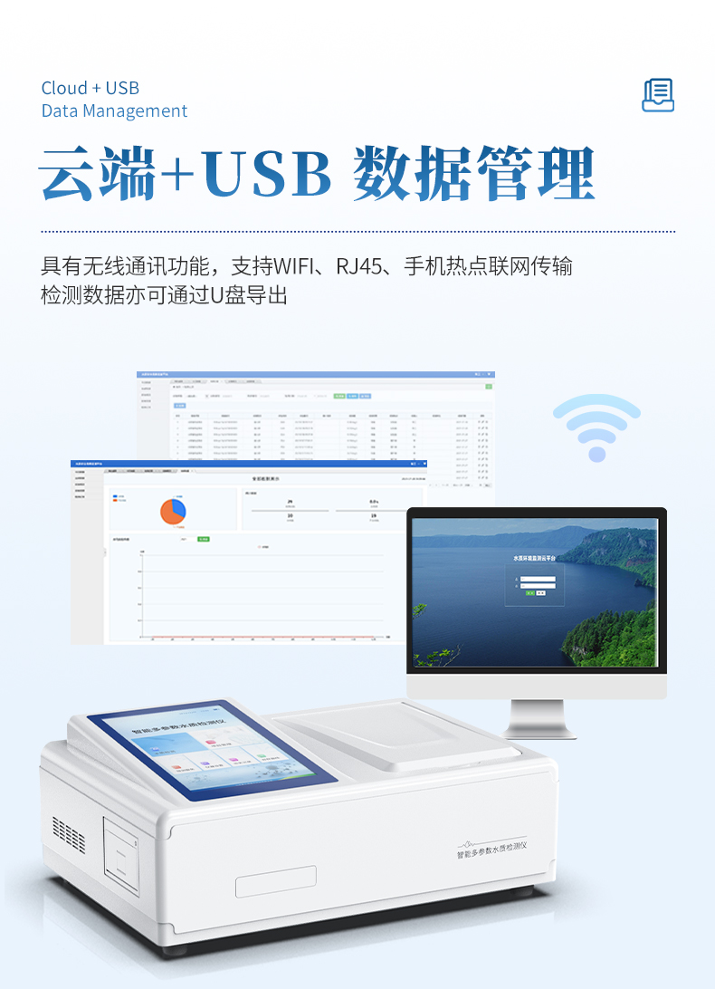 云平台:仪器带有监管平台,连接有线/无线网络,检测结果直接传输至环境安全监管平台。