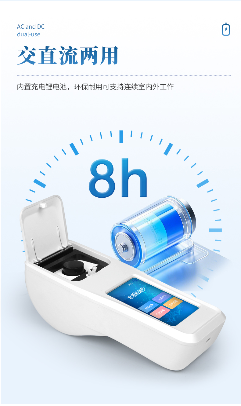 ⑨交直流两用,内置充电锂电池,环保耐用可支持连续室内外工作。