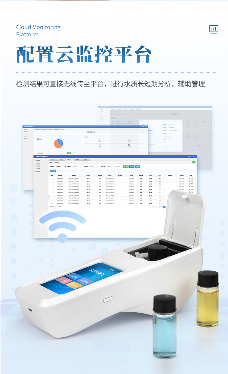 ②配置云监控平台,检测结果可直接无线传至平台,进行水质长短期分析,辅助管理。