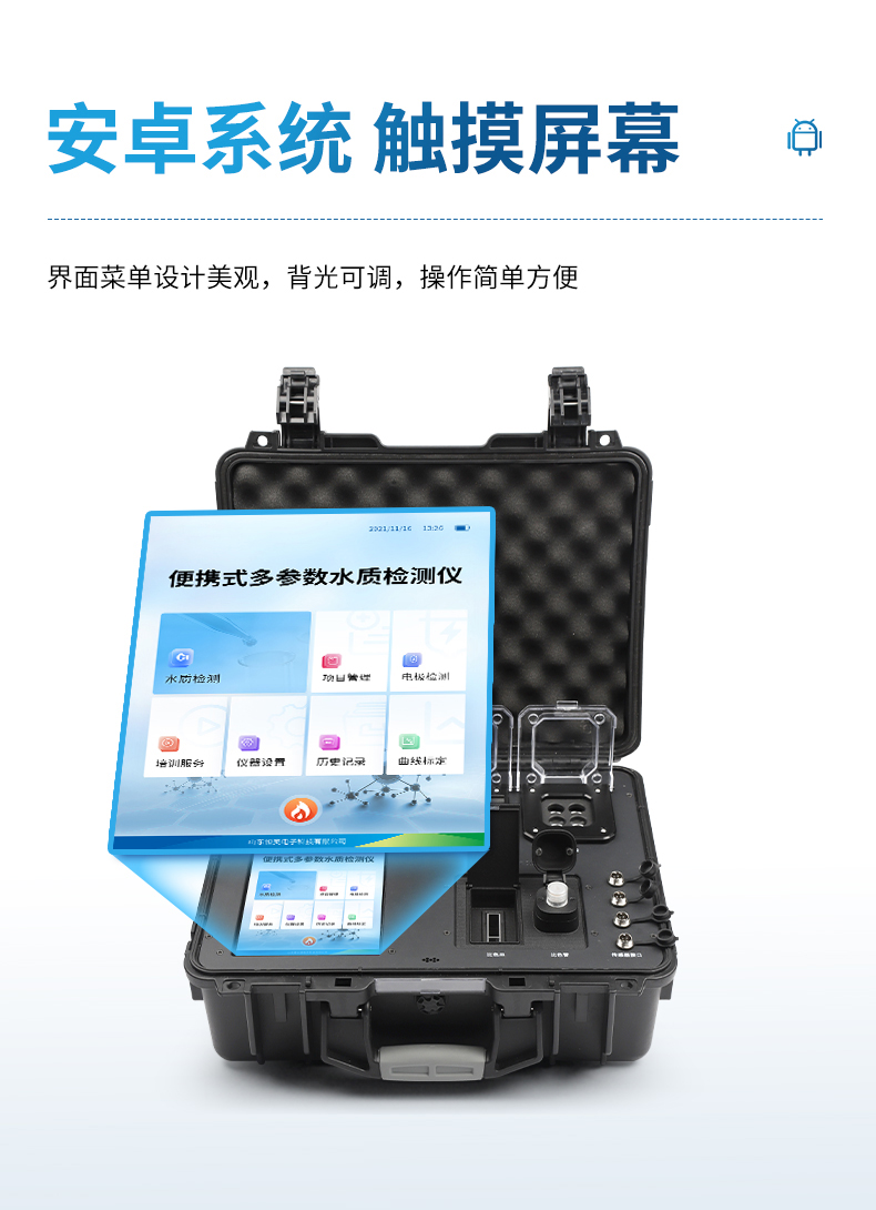 HW-BTN型便携式总氮检测仪采用高强度PVC工程塑料手提箱设计,消解检测一体式设计,其中消解模块具备双温区功能,检测部分同时具备360°旋转比色试管检测和比色皿检测,安卓智能操作系统,8英寸高清液晶触摸屏,光纤检测技术,进口光源,内置大容量锂电池,便携多参数水质检测仪具有性能稳定、测量准确、测定范围广、功能强大、操作简单等特点。