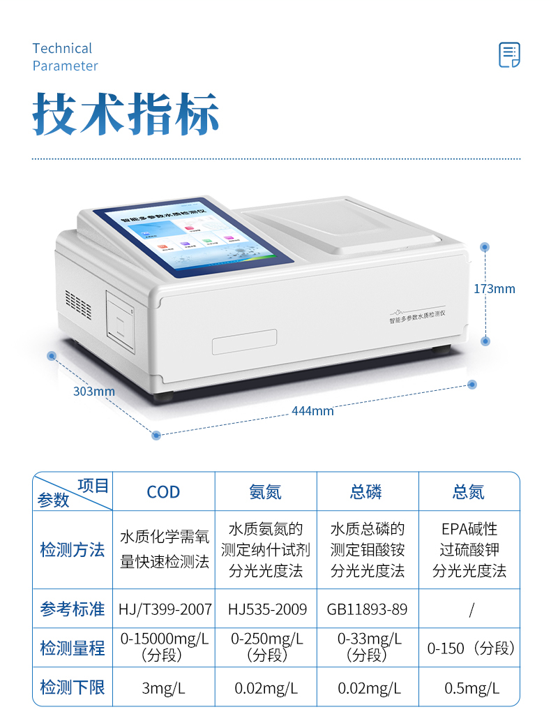 智能总氮测定仪是参考《水质总氮的测定碱性过硫酸钾消解紫外分光光度法》标准设计制造,主要检测水质总氮含量指标;本仪器兼具智能数据分析功能,图表、列表显示数据,分析一目了然;高清晰度彩色液晶触摸显示屏,Android智能操作系统,中文显示界面,中英文键盘,人性化操作,使用更简单。